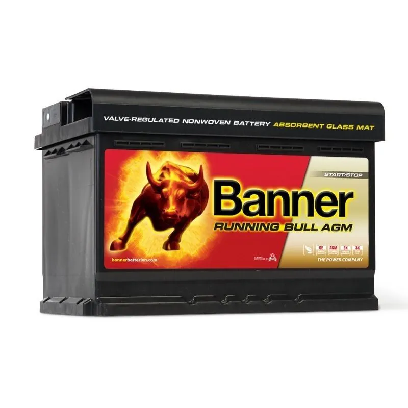 Banner RUNNING BULL AGM 70 Ач, пусковой ток 720 А, производства Австрия. Габаритные размеры аккумуляторной батареи составляют 278x175x190 мм по длине, ширине и высоте соответственно. Величина пускового тока 720 А согласно европейскому стандарту, ёмкость батареи составляет 70 Ач, тип токовывода - стандартные клеммы.