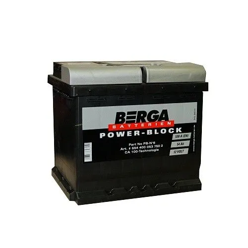 Berga POWER BLOCK 54 Ач, пусковой ток 530 А, производства Германия. Габаритные размеры аккумуляторной батареи составляют 207x175x190 мм по длине, ширине и высоте соответственно. Величина пускового тока 530 А согласно европейскому стандарту, ёмкость батареи составляет 54 Ач, тип токовывода - стандартные клеммы.