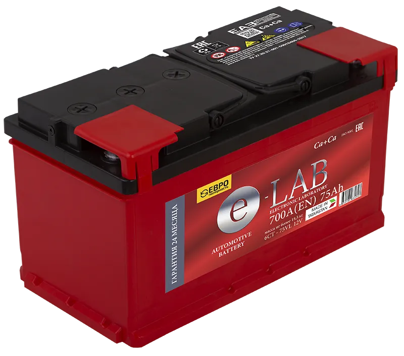E-lab 75 Ач, пусковой ток 700 А, производства Россия. Габаритные размеры аккумуляторной батареи составляют 278x175x190 мм по длине, ширине и высоте соответственно. Величина пускового тока 700 А согласно европейскому стандарту, ёмкость батареи составляет 75 Ач, тип токовывода - стандартные клеммы.