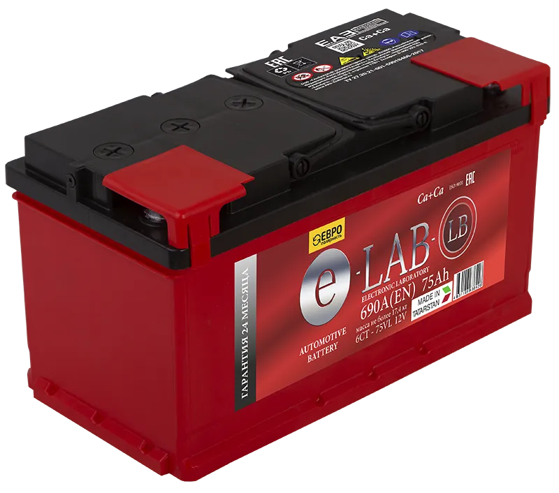 E-lab 75 Ач, пусковой ток 700 А, производства Россия. Габаритные размеры аккумуляторной батареи составляют 278x175x175 мм по длине, ширине и высоте соответственно. Величина пускового тока 700 А согласно европейскому стандарту, ёмкость батареи составляет 75 Ач, тип токовывода - стандартные клеммы.