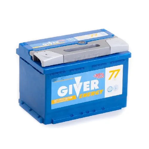 Giver ENERGY 6СТ-77.0 77 Ач, пусковой ток 750 А, производства Россия. Габаритные размеры аккумуляторной батареи составляют 275х175х190 мм по длине, ширине и высоте соответственно. Величина пускового тока 750 А согласно европейскому стандарту, ёмкость батареи составляет 77 Ач, тип токовывода - стандартные клеммы.