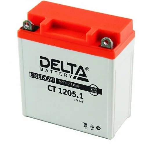 Delta CT 5 Ач, пусковой ток 45 А, производства Китай. Габаритные размеры аккумуляторной батареи составляют 120x61x129 мм по длине, ширине и высоте соответственно. Величина пускового тока 45 А согласно европейскому стандарту, ёмкость батареи составляет 5 Ач, тип токовывода - клеммы под болт.