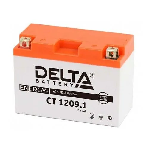 Delta CT 9 Ач, пусковой ток 115 А, производства Китай. Габаритные размеры аккумуляторной батареи составляют 151x71x107 мм по длине, ширине и высоте соответственно. Величина пускового тока 115 А согласно европейскому стандарту, ёмкость батареи составляет 9 Ач, тип токовывода - клеммы под болт.