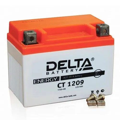 Delta CT 9 Ач, пусковой ток 135 А, производства Китай. Габаритные размеры аккумуляторной батареи составляют 152x87x107 мм по длине, ширине и высоте соответственно. Величина пускового тока 135 А согласно европейскому стандарту, ёмкость батареи составляет 9 Ач, тип токовывода - клеммы под болт.