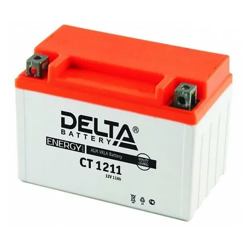 Delta CT 11 Ач, пусковой ток 210 А, производства Китай. Габаритные размеры аккумуляторной батареи составляют 150x87x110 мм по длине, ширине и высоте соответственно. Величина пускового тока 210 А согласно европейскому стандарту, ёмкость батареи составляет 11 Ач, тип токовывода - клеммы под болт.