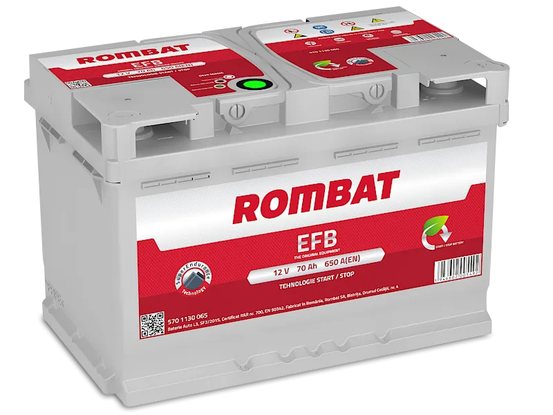 Rombat EFB 70 Ач, пусковой ток 650 А, производства Румыния. Габаритные размеры аккумуляторной батареи составляют 278х175х190 мм по длине, ширине и высоте соответственно. Величина пускового тока 650 А согласно европейскому стандарту, ёмкость батареи составляет 70 Ач, тип токовывода - стандартные клеммы.