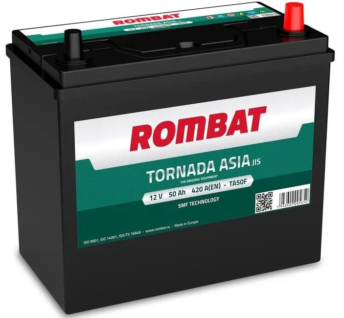 Rombat Tornada Asia 50 Ач, пусковой ток 420 А, производства Румыния. Габаритные размеры аккумуляторной батареи составляют 236х128х224 мм по длине, ширине и высоте соответственно. Величина пускового тока 420 А согласно европейскому стандарту, ёмкость батареи составляет 50 Ач, тип токовывода - тонкие клеммы.