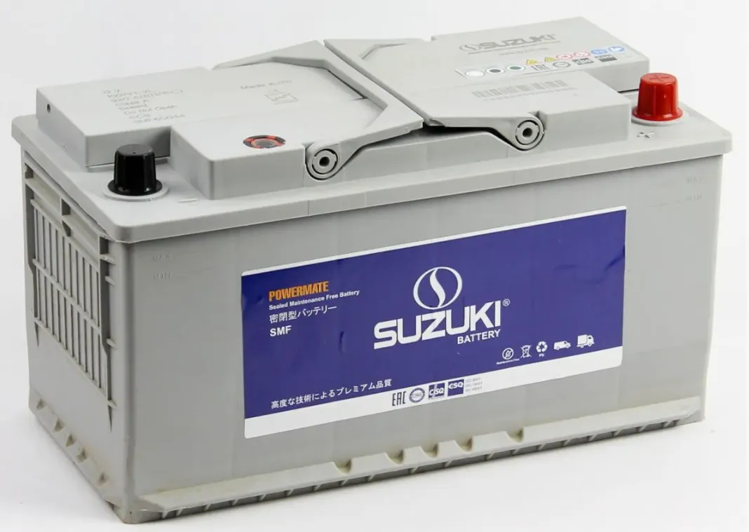 SUZUKI 100 Ач, пусковой ток 920 А, производства Япония. Габаритные размеры аккумуляторной батареи составляют 353х175х190 мм по длине, ширине и высоте соответственно. Величина пускового тока 920 А согласно европейскому стандарту, ёмкость батареи составляет 100 Ач, тип токовывода - стандартные клеммы.