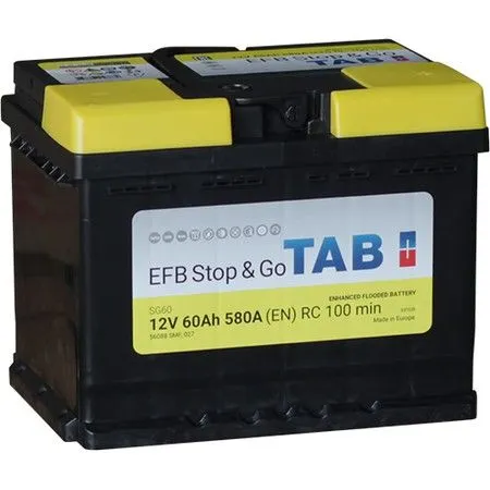 Tab EFB 60 Ач, пусковой ток 580 А, производства Словения. Габаритные размеры аккумуляторной батареи составляют 242x175x190 мм по длине, ширине и высоте соответственно. Величина пускового тока 580 А согласно европейскому стандарту, ёмкость батареи составляет 60 Ач, тип токовывода - стандартные клеммы.