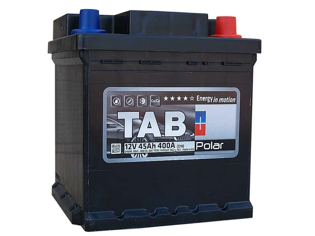 Tab Polar 45 Ач, пусковой ток 400 А, производства Словения. Габаритные размеры аккумуляторной батареи составляют 207x175x190 мм по длине, ширине и высоте соответственно. Величина пускового тока 400 А согласно европейскому стандарту, ёмкость батареи составляет 45 Ач, тип токовывода - стандартные клеммы.