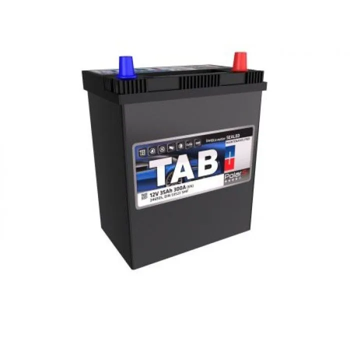 Tab Polar Asia 35 Ач, пусковой ток 300 А, производства Словения. Габаритные размеры аккумуляторной батареи составляют 196x134x225 мм по длине, ширине и высоте соответственно. Величина пускового тока 300 А согласно европейскому стандарту, ёмкость батареи составляет 35 Ач, тип токовывода - тонкие клеммы.