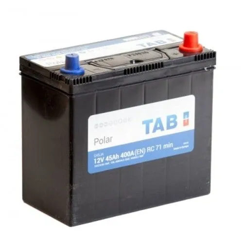 Tab Polar Asia 45 Ач, пусковой ток 400 А, производства Словения. Габаритные размеры аккумуляторной батареи составляют 237x127x225 мм по длине, ширине и высоте соответственно. Величина пускового тока 400 А согласно европейскому стандарту, ёмкость батареи составляет 45 Ач, тип токовывода - тонкие клеммы.