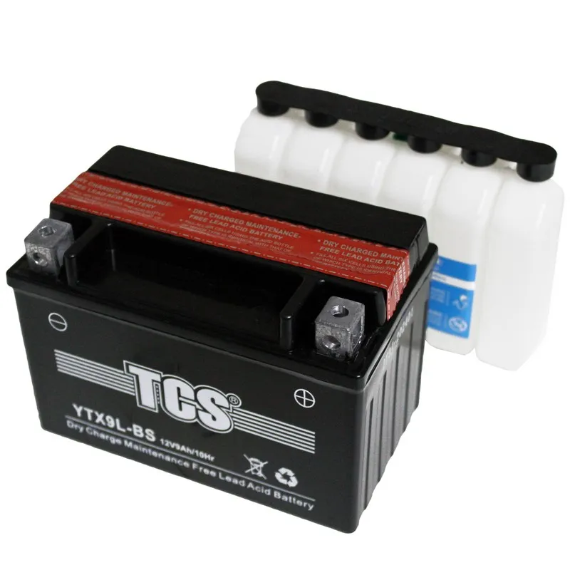 TCS 9 Ач, пусковой ток А, производства Китай. Габаритные размеры аккумуляторной батареи составляют 150x86x105 мм по длине, ширине и высоте соответственно. Величина пускового тока А согласно европейскому стандарту, ёмкость батареи составляет 9 Ач, тип токовывода - клеммы под болт.