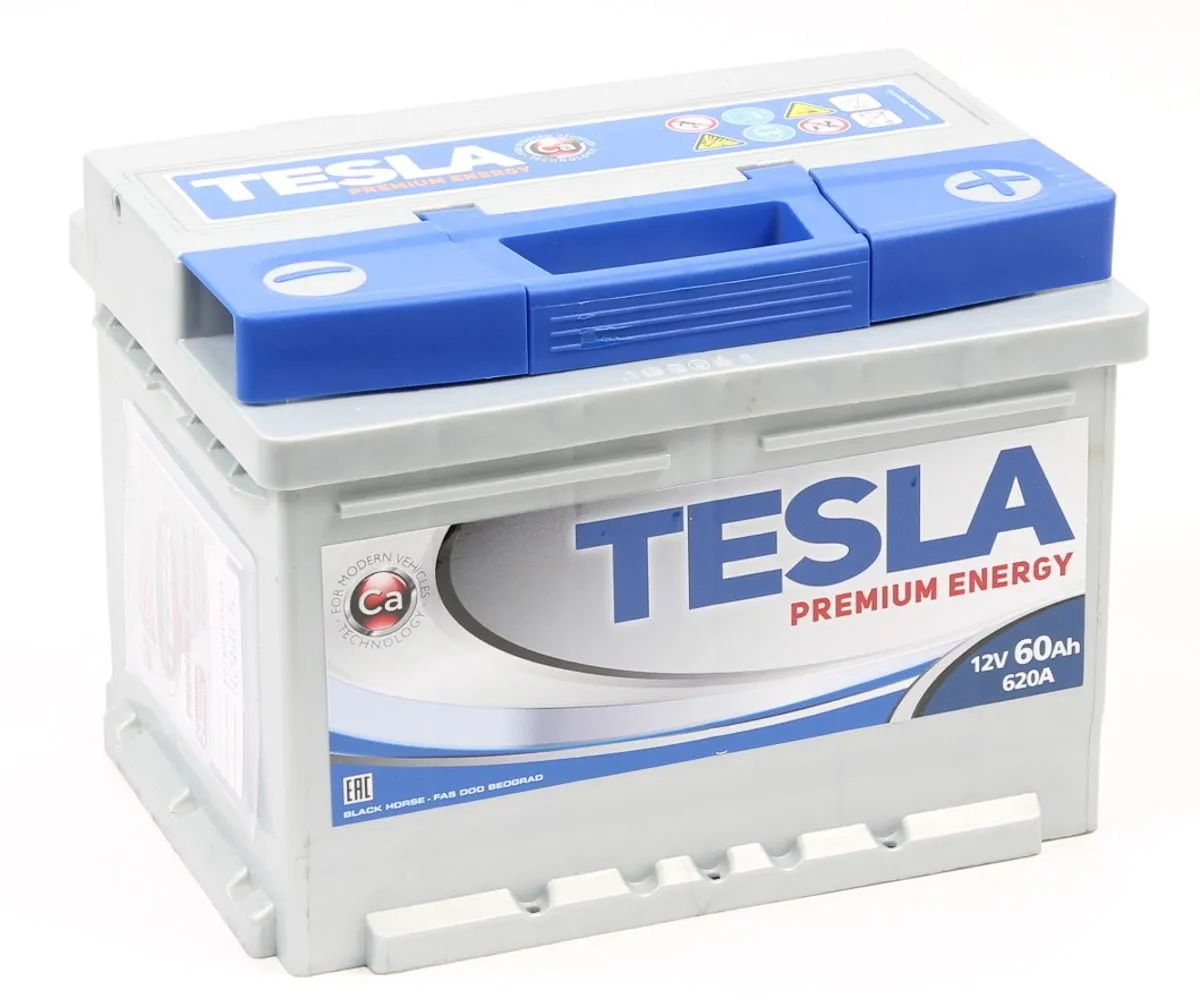 Tesla Premium Energy 60 Ач, пусковой ток 620 А, производства Сербия. Габаритные размеры аккумуляторной батареи составляют 242х175х190 мм по длине, ширине и высоте соответственно. Величина пускового тока 620 А согласно европейскому стандарту, ёмкость батареи составляет 60 Ач, тип токовывода - стандартные клеммы.