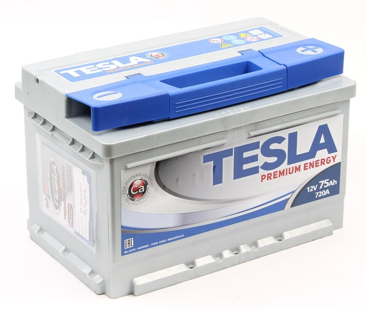 Tesla Premium Energy 75 Ач, пусковой ток 720 А, производства Сербия. Габаритные размеры аккумуляторной батареи составляют 278х175х175 мм по длине, ширине и высоте соответственно. Величина пускового тока 720 А согласно европейскому стандарту, ёмкость батареи составляет 75 Ач, тип токовывода - стандартные клеммы.