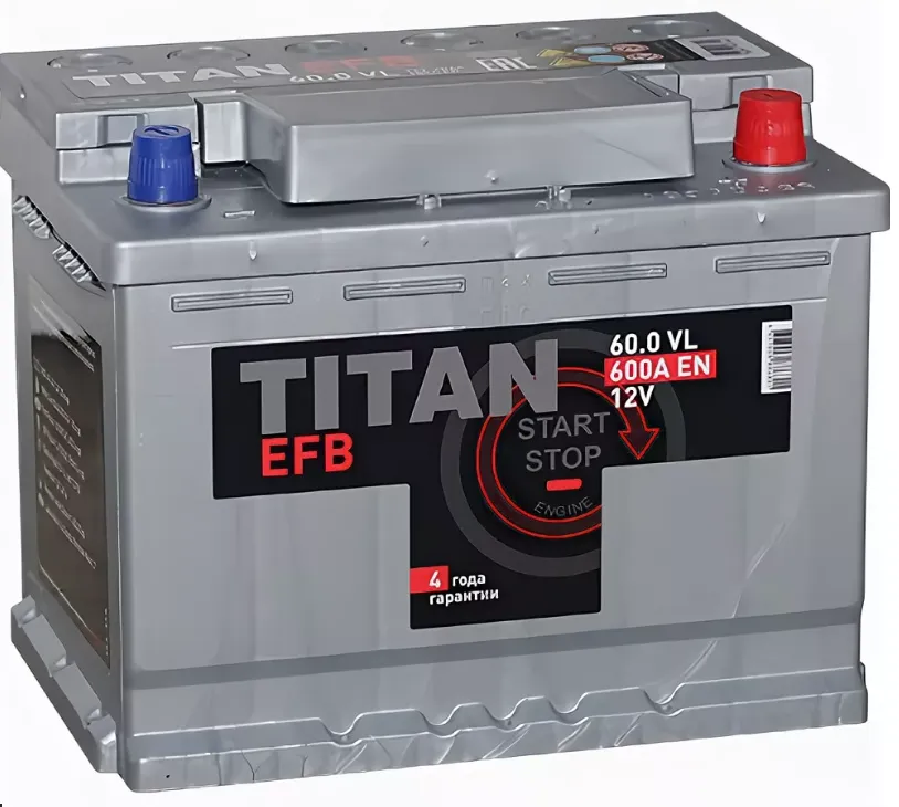 TiTan EFB 60 Ач, пусковой ток 600 А, производства Россия. Габаритные размеры аккумуляторной батареи составляют 242x175x190 мм по длине, ширине и высоте соответственно. Величина пускового тока 600 А согласно европейскому стандарту, ёмкость батареи составляет 60 Ач, тип токовывода - стандартные клеммы.