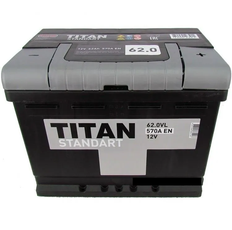 TiTan STANDART 62 Ач, пусковой ток 570 А, производства Россия. Габаритные размеры аккумуляторной батареи составляют 242x175x190 мм по длине, ширине и высоте соответственно. Величина пускового тока 570 А согласно европейскому стандарту, ёмкость батареи составляет 62 Ач, тип токовывода - стандартные клеммы.