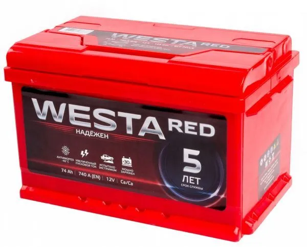 Westa 74 Ач, пусковой ток 750 А, производства Россия. Габаритные размеры аккумуляторной батареи составляют 278х175х175 мм по длине, ширине и высоте соответственно. Величина пускового тока 750 А согласно европейскому стандарту, ёмкость батареи составляет 74 Ач, тип токовывода - стандартные клеммы.