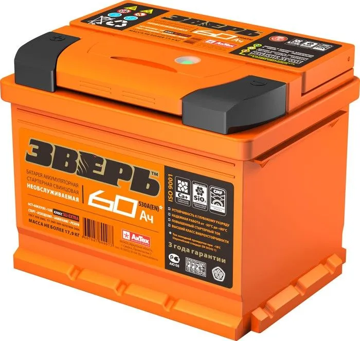 Зверь 60 Ач, пусковой ток 650 А, производства Россия. Габаритные размеры аккумуляторной батареи составляют 242х175х190 мм по длине, ширине и высоте соответственно. Величина пускового тока 650 А согласно европейскому стандарту, ёмкость батареи составляет 60 Ач, тип токовывода - стандартные клеммы.